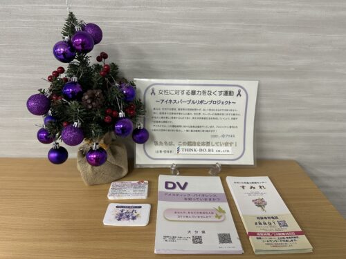 【アイネスパープルリボンプロジェクト2025】賛同しています 毎年11月12日~25日の2週間は「全国で女性に対する暴力根絶のための啓発活動」が行われています 紫色「パープル」は女性に対するあらゆる暴力の根絶を広く呼び掛けるテーマカラーであり、 被害者に対して「ひとりで悩まず、まずは相談してください」のメッセージが込められています 弊社もこのプロジェクトに賛同し、暴力根絶に取り組みます 事務所内パープルツリー設置